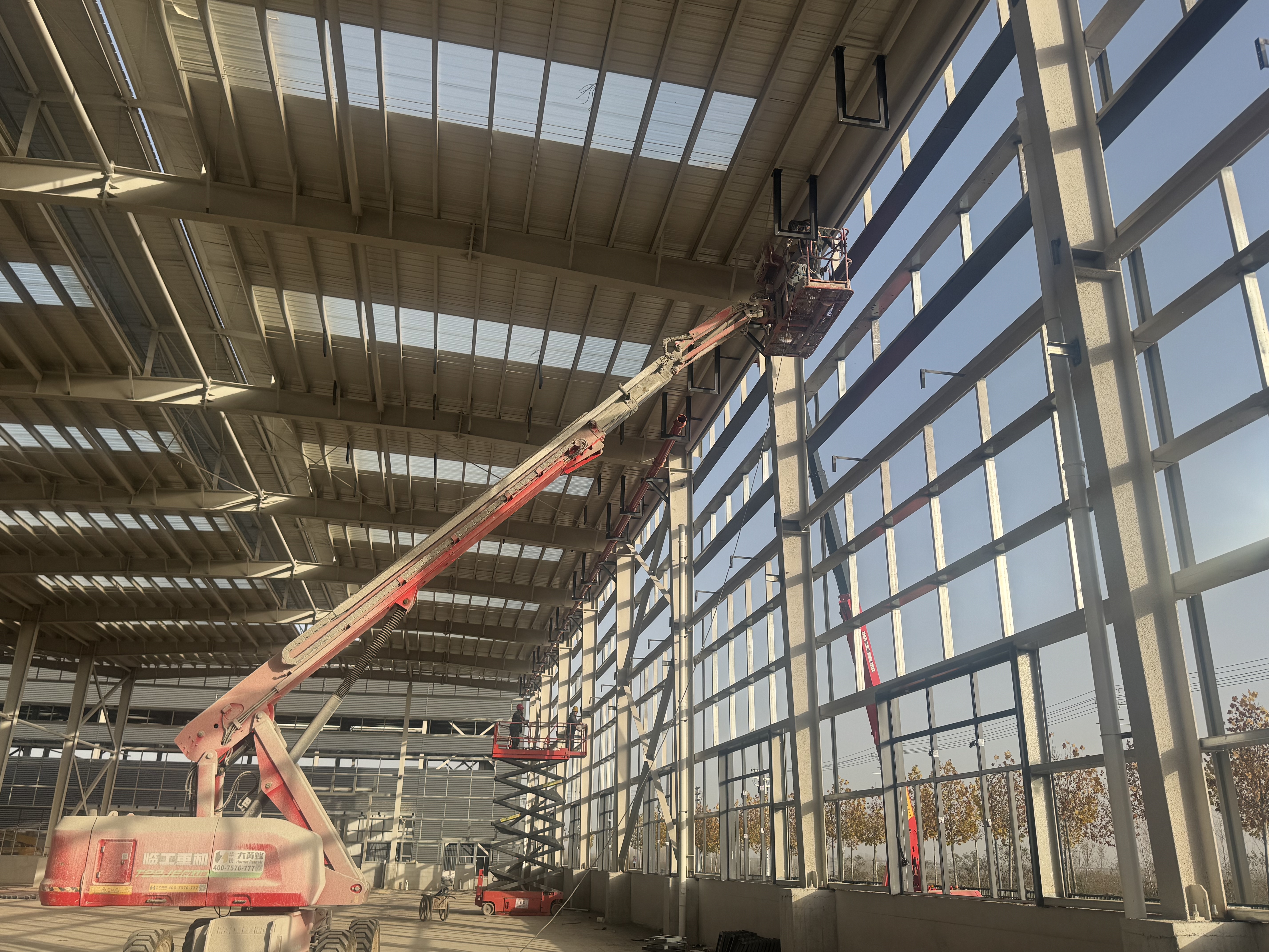 在鋼結構施工戰(zhàn)場上,曲臂車大顯身手。其靈活臂展精準定位高空墻板,將安裝效率提升30%,搭配模塊化施工模式實現(xiàn)快速精準拼裝。目前,丙類車間B鋼結構圍護結構已全面完成安裝,丙類倉庫A消防管道安裝完成一跨,為后續(xù)工序推進筑牢基礎。